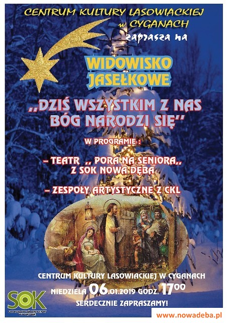 Centrum Kultury Lasowiackiej w Cyganach zaprasza 6 stycznia 2019 r. o godz. 17:00 na przedstawienie jasełkowe pt. "Dziś wszystkim z nas Bóg narodzi się" w wykonaniu teatru "Pora na Seniora" działającego w Samorządowym Ośrodku Kultury w Nowej Dębie. W koncercie kolęd wystąpią grupy artystyczne z CKL. Nie zabraknie również słodkiego poczęstunku i wspólnego kolędowania.