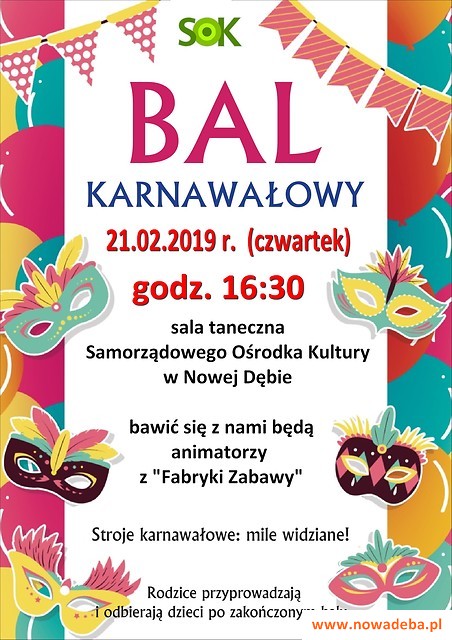 Serdecznie zapraszamy dzieci na Bal karnawałowy, który odbędzie się 21 lutego godz. 16:30 w sali tanecznej SOK.
