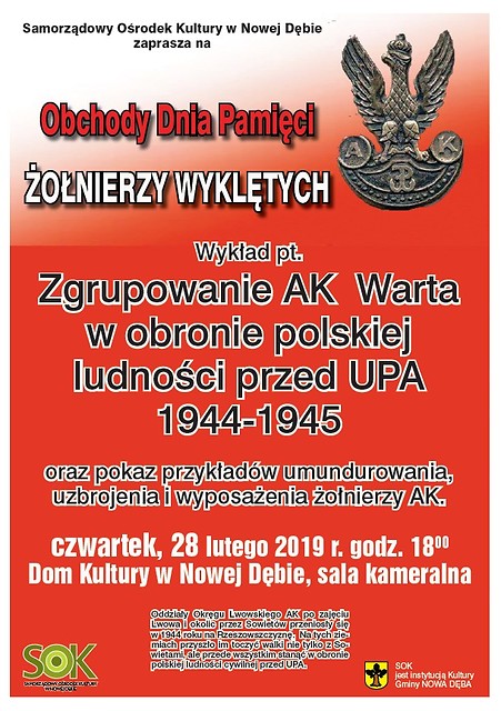 Samorządowy Ośrodek Kultury w Nowej Dębie serdecznie zaprasza na obchody Dnia Pamięci Żołnierzy Wyklętych, które odbędą się 28 lutego o godz. 18:00 w sali kameralnej SOK. Tematem spotkania będzie: „Zgrupowanie AK Warta w obronie polskiej ludności przed UPA 1944-1945”. Pokażemy przykłady umundurowania, uzbrojenia i wyposażenia żołnierzy AK.