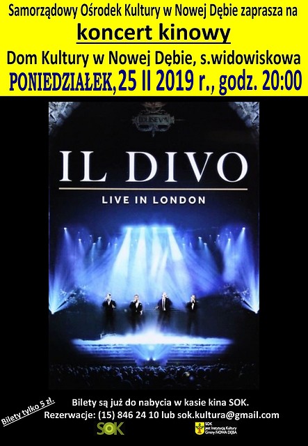 Samorządowy Ośrodek Kultury w Nowej Dębie serdecznie zaprasza na koncert kinowy IL DIVO. Projekcja odbędzie się w poniedziałek, 25 lutego 2019 r. o godz. 20:00.