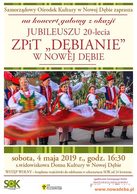 Samorządowy Ośrodek Kultury w Nowej Dębie serdecznie zaprasza wszystkich mieszkańców naszej gminy, którzy cenią sobie rodzimą kulturę i tradycję - na koncert jubileuszowy z okazji 20-lecia Zespołu Pieśni i Tańca "Dębianie".