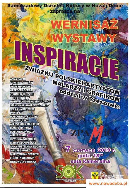 Serdecznie zapraszamy na wernisaż wystawy „Inspiracje” Związku Polskich Artystów Malarzy i Grafików oddział w Rzeszowie, który odbędzie się w sali kameralnej SOK w dniu 7 czerwca 2019 r.o godz. 18:00.