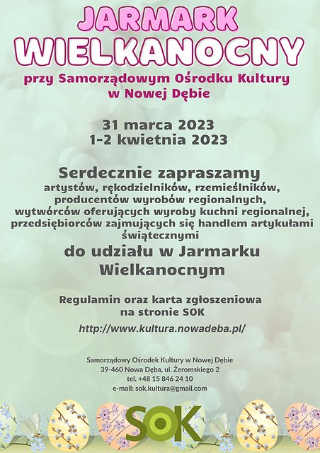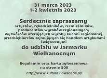 Zapraszamy artystów, rękodzielników, rzemieślników, producentów wyrobów regionalnych, wytwórców oferujących produkty kuchni regionalnej, przedsiębiorców zajmujących się handlem artykułami świątecznymi do udziału w Jarmarku Wielkanocnym, który odbędzie się w dniach 31 marca - 2 kwietnia 2023 r. na placu przed Samorządowym Ośrodkiem Kultury.