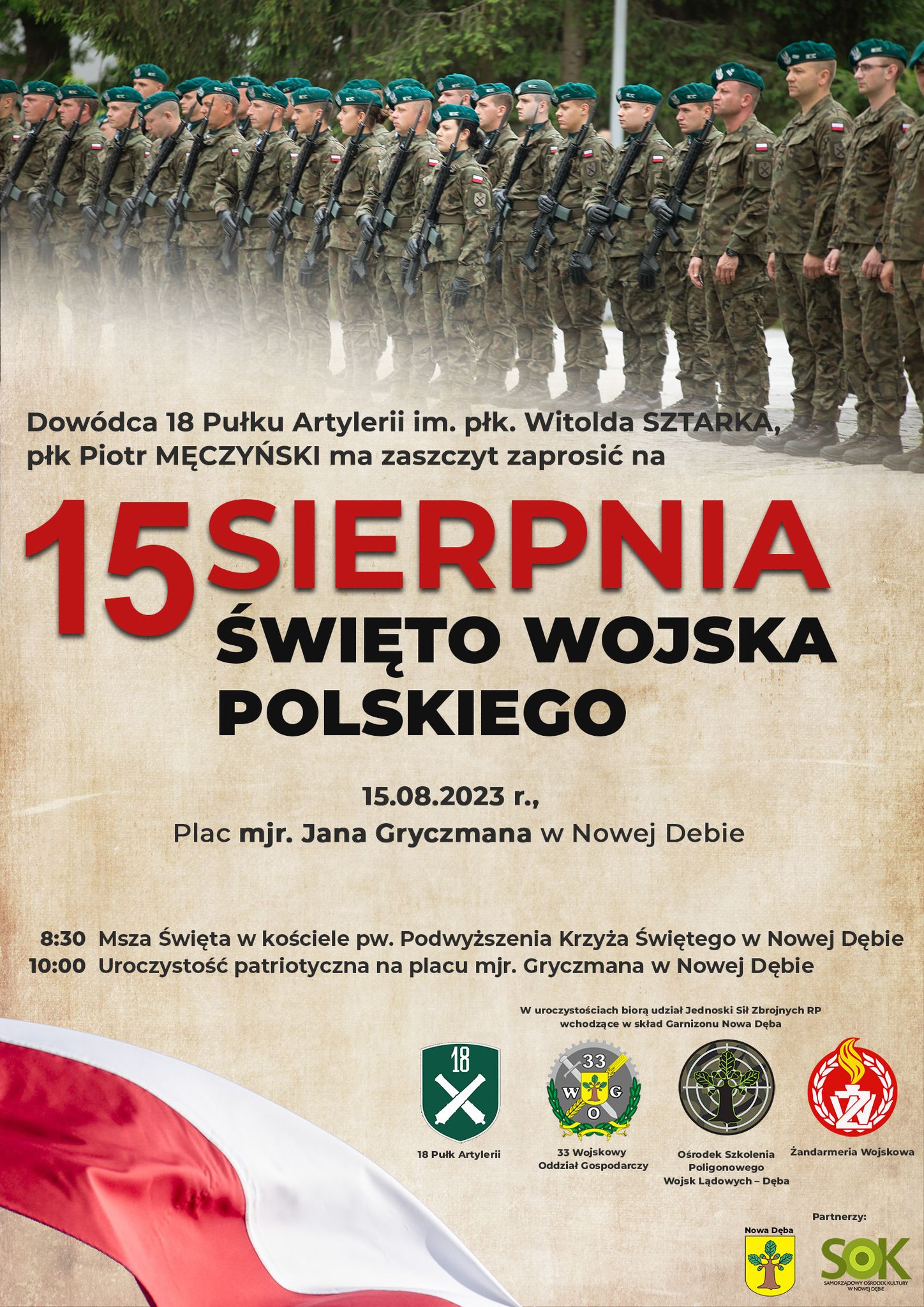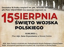 Zapraszamy na uroczystości Święta Wojska Polskiego 15 sierpnia 2023. Uroczystości rozpoczną się o godz. 8:30 Mszą Świętą w kościele pw. Podwyższenia Krzyża Świętego w Nowej Dębie następnie przeniesiemy się na plac mjr Jana Gryczmana w Nowej Dębie gdzie uroczystości patriotyczne poprowadzi 18. Pułk Artylerii oraz inne jednostki Sił Zbrojnych RP wchodzące w skład Garnizonu Nowa Dęba