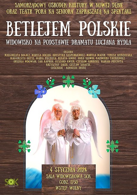 Teatr „Pora na Seniora" zaprasza 4 stycznia 2024 r. o godz.17.30 na niezwykłe widowisko oparte na dramacie Lucjana Rydla "Betlejem Polskie". Rydlowskie "Betlejem..." dzieje się jednocześnie w trzech planach czasowych – w polskiej współczesności, w naszej rodzimej historii i w czasach biblijnych. Jest wpisane w polski krajobraz i rzeczywistość historyczną – ożywia przeszłość. Jezus rodzi się tu wśród polskiej zimy, a Betlejem leży w Polsce w naszej rodzimym Podkarpaciu i Małopolsce a może na Kaszubach. Biblijny Herod nie jest tylko władcą starożytnej Palestyny, lecz ciemiężycielem Polski i rusyfikatorem; betlejemscy Trzej Królowie to nasi władcy: Kazimierz Wielki, Władysław Jagiełło i Jan III Sobieski. Scenariusz spektaklu nawiązuje do najwspanialszych kart naszej historii. Jest to patriotyczne, rozśpiewane widowisko z humorem, tańcem, Świętą Rodziną.