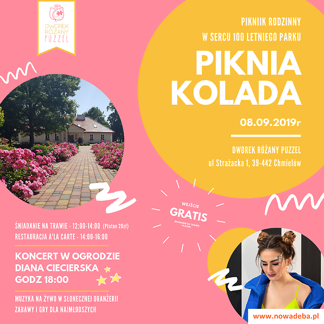 Zapraszamy wszystkich na PikniaKolade, I-szy piknik organizowany w rezydencji Dworek Różany Puzzel w Chmielowie. Podczas PikniaKolady, oddajemy do Waszej dyspozycji 2ha Parku, domu Pomników Przyrody z wytyczonymi ścieżkami, ławeczkami, placem zabaw, altaną i specjalnie przygotowanymi na ten dzień atrakcjami w Parku. Zaczynamy od g: 12:00 "Śniadanie na Trawie" w formie bufetu - jesz ile chcesz! (Cena 20zł) W budynku pierwszym od wjazdu, mieści się Sala Różana ze słoneczną oranżerią, gdzie w dniu pikniku będziecie mogli skosztować zamówione z karty dania, rozkoszując się w tym czasie widokiem Parku. Czas posiłku umilą Wam muzycy grający na żywo. Wieczorem koncert w ogrodzie: Diana Ciecierska!!