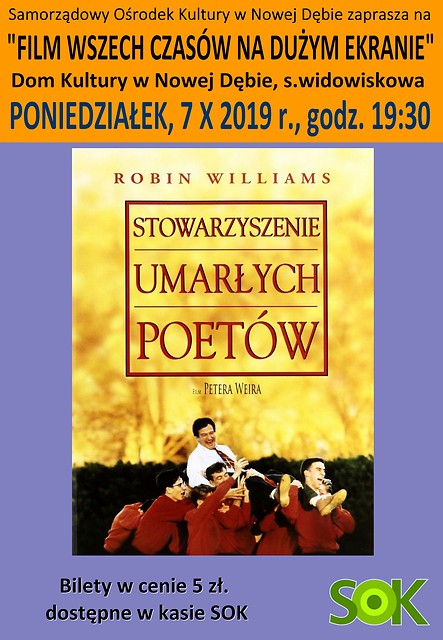 „W starym kinie” - w każdy pierwszy poniedziałek miesiąca - zapraszamy na emisję filmów z przeszłości. Będą to filmy zarówno z dużego jak i małego ekranu począwszy od lat 60. Zapraszamy 7 października o godz. 19:30. Wyświetlimy film "Stowarzyszenie Umarłych Poetów". Bilety w cenie 5 zł. do nabycia w kasie SOK.
