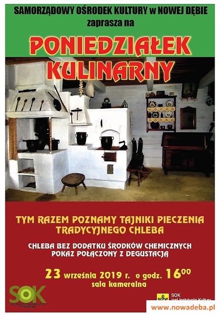 Zapraszamy 23 września 2019 r. o godz. 16.00 na kolejny poniedziałek kulinarny, tym razem poznamy tajniki pieczenia chleba. W naszej tradycji chleb nie jest tylko pokarmem, ma również znaczenie symboliczne, jest ucieleśnieniem dobra i szacunku do pracy. Bo ileż to pracy trzeba było włożyć, żeby na stole był bochen chleba. Chleb jest pokarmem sytym. Doskonale zaspokaja głód fizyczny. I chociaż spożywamy go codziennie, czasami kilka razy dziennie, nigdy nam się nie znudził, w przeciwieństwie do innych posiłków. Chleb ma wyjątkowy smak i zapach. A właściwie do tej pory wymagał, aby powstał dużo wysiłku. Dziś do wypieku chleba w dużych piekarniach używa się mnóstwa dodatków chemicznych i nie ma on tych wartości, które winien mieć chleb. Poznamy tajniki pieczenia tradycyjnego chleba bez dodatku środków chemicznych. Pokaz połączony z degustacją.
