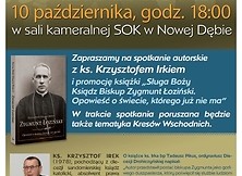 Samorządowy Ośrodek Kultury w Nowej Dębie serdecznie zaprasza w czwartek, 10 października o godz. 18:00 do Domu Kultury na spotkanie autorskie z ks. Krzysztofem Irkiem i promocję książki „Sługa Boży Ksiądz Biskup Zygmunt Łoziński. Opowieść o świecie, którego już nie ma”. W trakcie spotkania poruszana będzie także tematyka Kresów Wschodnich. Wstęp na spotkanie bezpłatny.