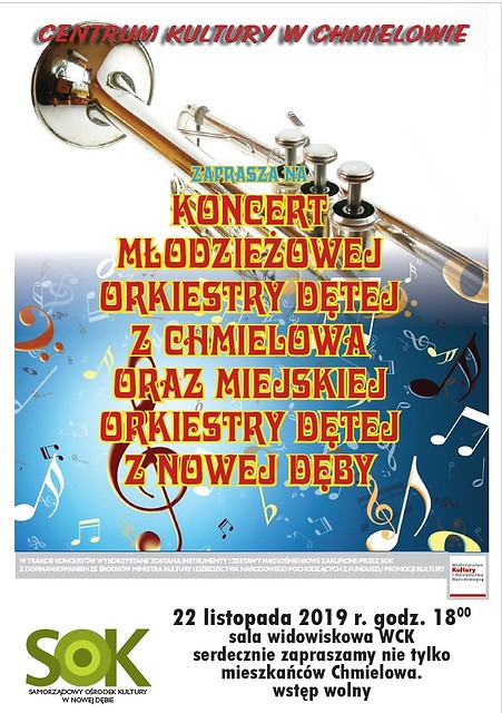 22 listopad 2019 r. o godzinie 18:00 w Centrum Kultury w Chmielowie odbędzie się koncert Młodzieżowej Orkiestry Dętej z Chmielowa oraz Miejskiej Orkiestry Dętej z Nowej Dęby. Serdecznie zapraszamy nie tylko mieszkańców Chmielowa.