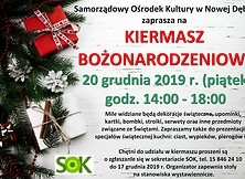 Zapraszamy lokalnych twórców z terenu miasta i gminy Nowa Dęba oraz okolic do udziału w Kiermaszu Bożonarodzeniowym, który odbędzie się 20 grudnia 2019 r. (piątek) w  godz. 14:00 - 18:00 w holu dolnym SOK. Mile widziane będą dekoracje świąteczne, upominki, kartki, bombki, stroiki, serwety oraz inne przedmioty związane ze Świętami. Zapraszamy także do prezentacji specjałów świątecznej kuchni: ciast, wypieków, pierogów itp.