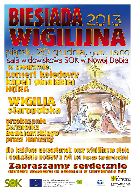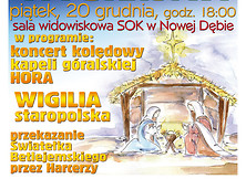 Samorządowy Ośrodek Kultury w Nowej Dębie serdecznie zaprasza na Biesiadę Wigilijną, któa odbędzie się 20 grudnia o godz. 18:00 w sali widowiskowej SOK. W programie: koncert kolędowy kapeli góralskiej HORA, Wigilia staropolska, przekazanie Światełka Betlejemskiego przez Harcerzy. Dla każdego poczęstunek przy wigilijnym stole oraz degustacja potraw z ryb LGR Puszczy Sandomierskiej.