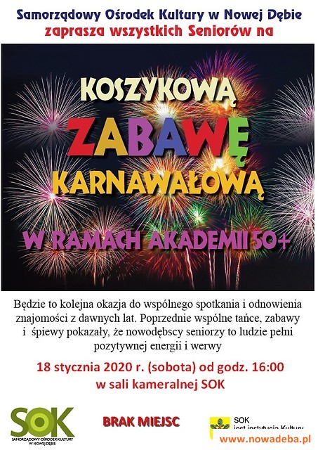 W ramach Akademii 50+ zapraszamy wszystkich Seniorów na koszyczkową zabawę karnawałową – 18 stycznia 2020 r. Będzie to kolejna okazja do wspólnego spotkania i odnowienia znajomości z dawnych lat. Poprzednie wspólne tańce, zabawy i śpiewy pokazały, że nowodębscy seniorzy to ludzie pełni pozytywnej energii i werwy. Wejściówki do nabycia u p. Ewy Kieliszek (od 2.01.2020 r.)