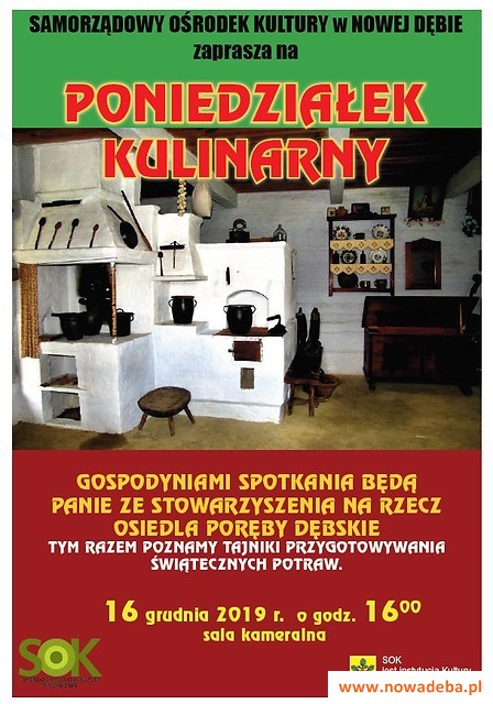 Zapraszamy 16 grudnia 2019 r. o godz. 16:00 na kolejny poniedziałek kulinarny, tym razem pod czujnym okiem Pań ze Stowarzyszenia na Rzecz Osiedla Poręby Dębskie poznamy tajniki przygotowywania świątecznych potraw. Pokaz połączony z degustacją. Serdecznie zapraszamy!