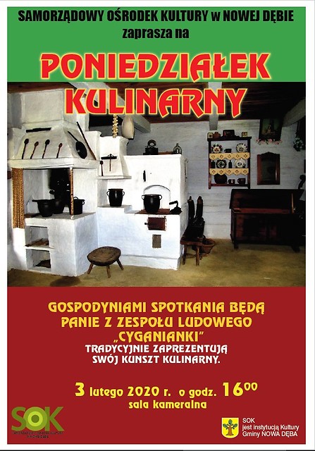 Zapraszamy już 3 lutego o godz. 16.00 na kolejny poniedziałek kulinarny. Tradycyjnie już Panie z Zespołu „Cyganianki" zaprezentują swój kunszt kulinarny.