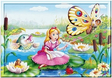 Kwa, kwa, brekekekeks!? – to było wszystko, co potrafił powiedzieć, kiedy zobaczył śliczną, maleńką dziewuszkę w łupinie orzecha. – Nie mów tak głośno, bo się obudzi – powiedziała stara ropucha. I jeszcze nam ucieknie, bo jest lekka jak łabędzi puch. Posadzimy ją na rzece, na dużym liściu lilii wodnej, tam jej będzie dobrze. Ona jest taka lekka i mała, że liść ten jest dla niej całą wyspą. Stamtąd nam nie ucieknie. A my tymczasem doprowadzimy do porządku odświętną izbę pod bagnem, gdzie zamieszkacie po ślubie.