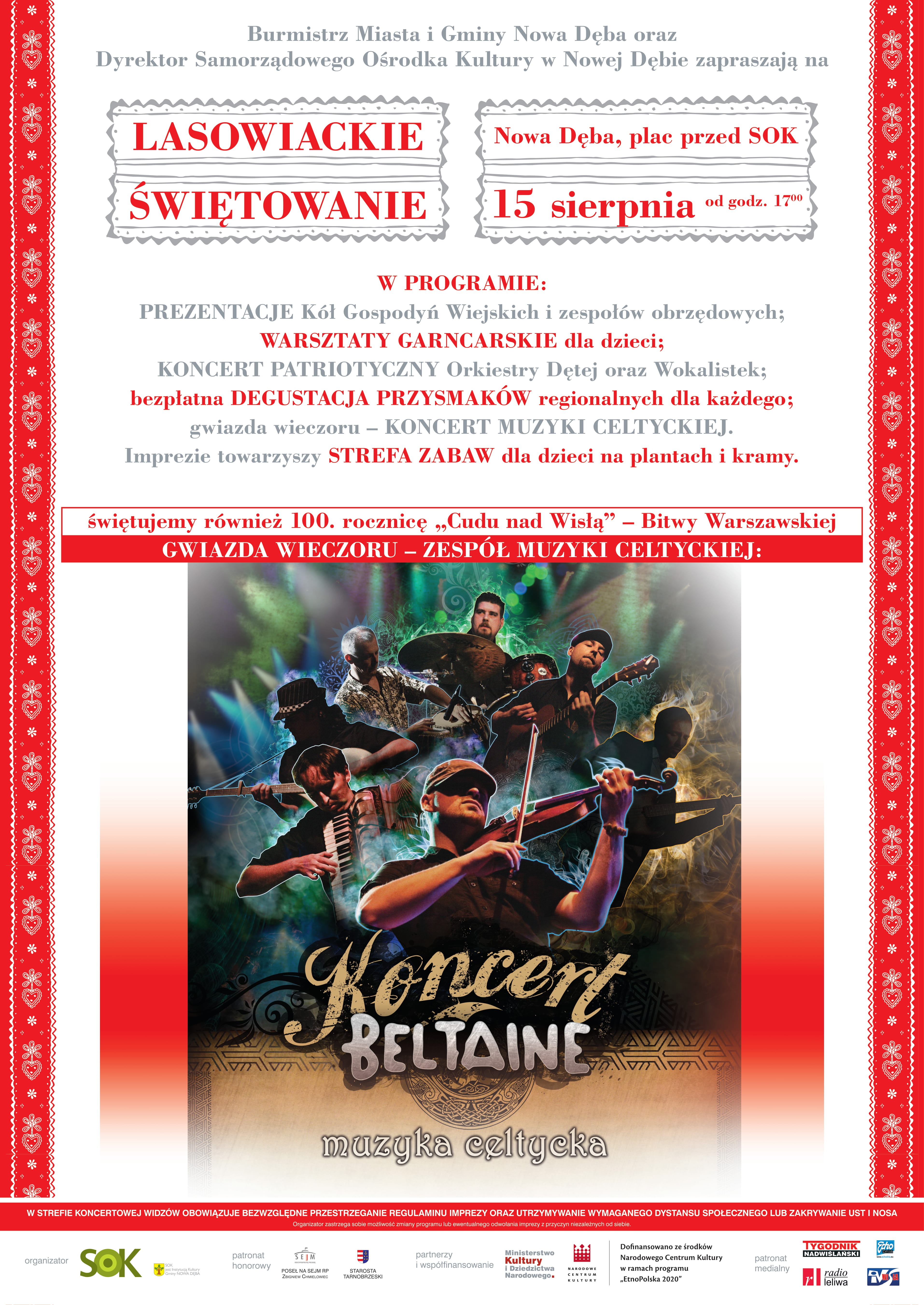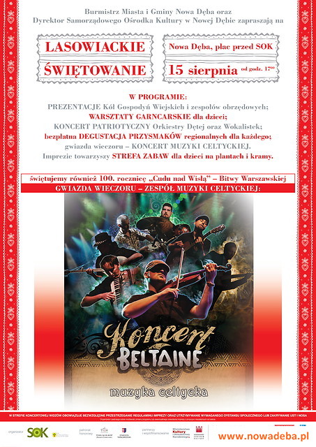 Burmistrz miasta i gminy Nowa Dęba oraz dyrektor Samorządowego Ośrodka Kultury w Nowej Dębie zapraszają na LASOWIACKIE ŚWIĘTOWANIE, której odbędzie się 15 sierpnia od godz. 17:00 na placu przed Domem Kultury.
