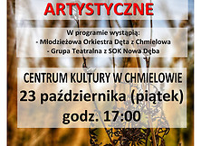 Samorządowy Ośrodek Kultury w Nowej Dębie zaprasza na widowisko "Jesienne spotkanie artystyczne", które odbędzie się 23 października 2020 r. (piątek) o godz. 17:00 w Centrum Kultury w Chmielowie. W programie wystąpią: Młodzieżowa Orkiestra Dęta z Chmielowa oraz Grupa Teatralna z SOK Nowa Dęba.