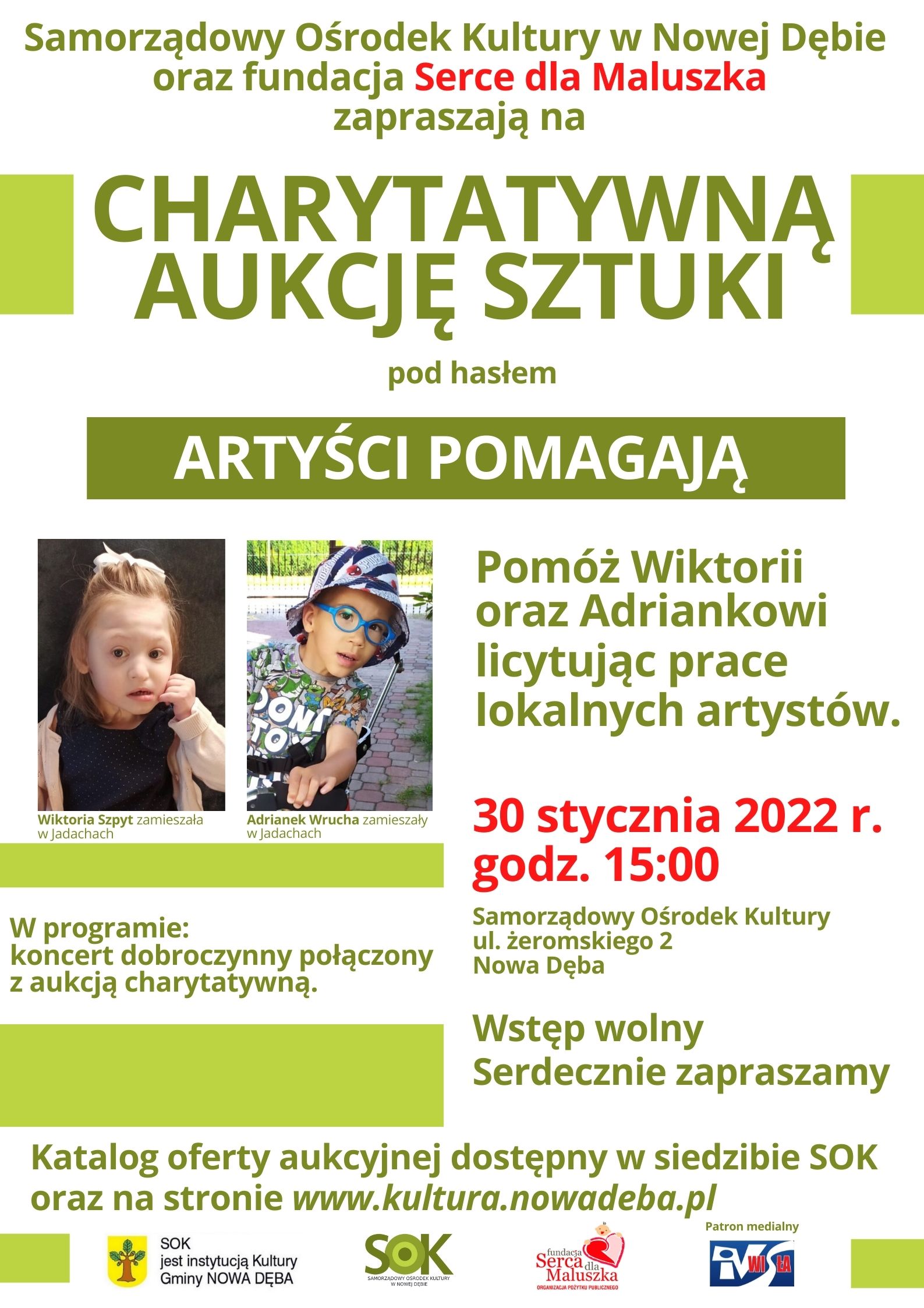 Studio Muzyki Rozrywkowej eMKa z Nowej Dęby, Chór Soli Deo z Tarnowskiej Woli, Młodzieżowa Orkiestra Dęta z Chmielowa oraz Orkiestra Dęta z Nowej Dęby serdecznie zapraszają na koncert charytatywny w dniu 30.01.2022 r. w Samorządowym Ośrodku Kultury w Nowej Dębie. Zespoły zaprezentują przepiękne polskie kolędy, zagraniczne utwory świąteczne oraz porządną dawkę muzyki rozrywkowej. W programie znajdą się m.in. kolędy: Tryumfy Króla Niebieskiego, Północ już była, a także utwory znakomitych artystów polskich, m.in. Anny Jantar, Zbigniewa Wodeckiego, oraz zagranicznych, m.in. Jose Feliciano, Wham!, Walk the Moon, a także utwory z musicalu Upiór w operze. Serdecznie zapraszamy!