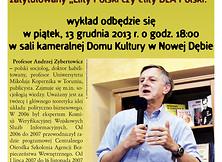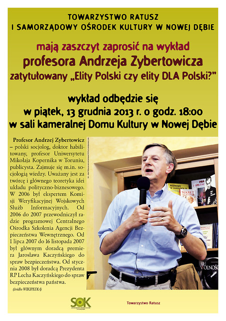 Towarzystwo Ratusz i Samorządowy Ośrodek Kultury w Nowej Dębie zapraszają na wykład profesora Andrzej Zybertowicza zatytułowany "Elity Polski czy Elity DLA Polski?" Wykład odbędzie się 13 grudnia o godz. 18:00 w sali kameralnej SOK.