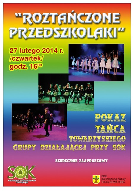 Samorządowy Ośrodek Kultury w Nowej Dębie serdecznie zaprasza 27 lutego (czwartek), godz. 16:00 na drugi już przegląd pod nazwą: "Roztańczone przedszkolaki". Na scenie SOK zaprezentują się dzieci z nowodębskich przedszkoli. Podczas przeglądu odbędzie się również pokaz tańca towarzyskiego grupy działającej przy SOK pod czujnym okiem instruktora - Marka Dudy.