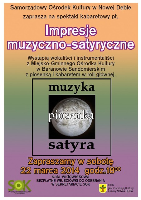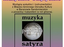 Samorządowy Ośrodek Kultury serdecznie zaprasza 22 marca 2014 r. o godz. 18:00 na spektakl kabaretowy pt. „Impresje muzyczno-satyryczne”. Wystąpią wokaliści i instrumentaliści z Miejsko-Gminnego Ośrodka Kultury w Baranowie Sandomierskim z piosenką i kabaretem w roli głównej.