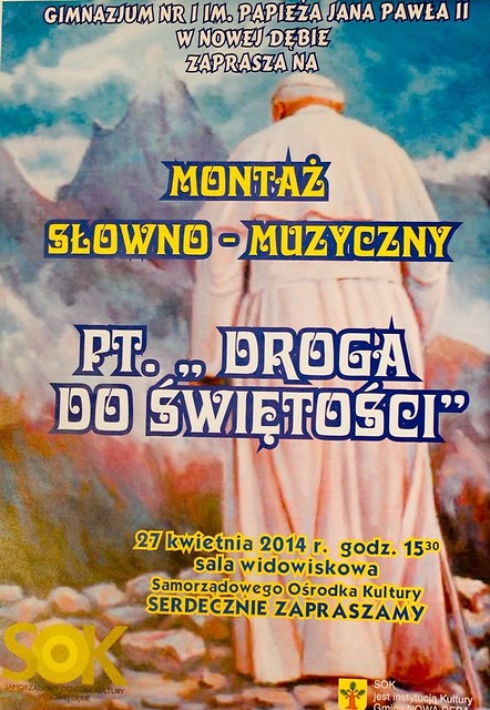 Gimnazjum nr 1 im. Papieża Jana Pawła II w Nowej Dębie zaprasza wszystkich mieszkańców na montaż słowno-muzyczny pt. "Droga do świętości".