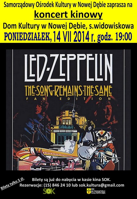 Samorządowy ośrodek Kultury w Nowej Dębie serdecznie zaprasza ponownie na film koncertowy Led Zeppelin - The Song Remains the Same. Projekcja kinowa odbędzie się w poniedziałek, 14 lipca o godz. 19:00.