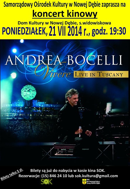 Samorządowy Ośrodek Kultury w Nowej Dębie serdecznie zaprasza ponownie na film koncertowy Andrea Bocelli "Vivere Live in Tuscany". Projekcja kinowa odbędzie się w poniedziałek, 21 lipca o godz. 19:30.