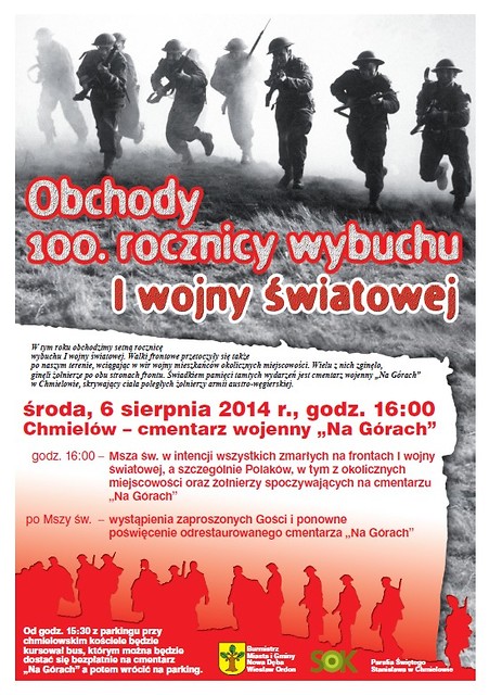 W tym roku obchodzimy setną rocznicę wybuchu I wojny światowej. Walki frontowe przetoczyły się także po naszym terenie, wciągając w wir wojny mieszkańców okolicznych miejscowości. Wielu z nich zginęło, ginęli żołnierzy po obu stronach frontu. Świadkiem pamięci tamtych wydarzeń jest cmentarz wojenny „Na Górach” w Chmielowie, skrywający ciała poległych żołnierzy armii austro-węgierskiej.