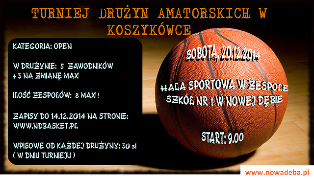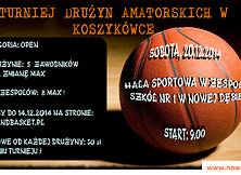 Zapraszamy do udziału w Turnieju drużyn amatorskich w koszykówce, współorganizowanym przez Samorządowy Ośrodek Sportu i Rekreacji w Nowej Dębie. Turniej odbędzie sie w dniu 20 grudnia 2014 r. (tj. sobota) o godz. 9.00 w hali sportowej Zespołu Szkół nr 1 w Nowej Dębie. Zapisy na stronie www.ndbasket.pl