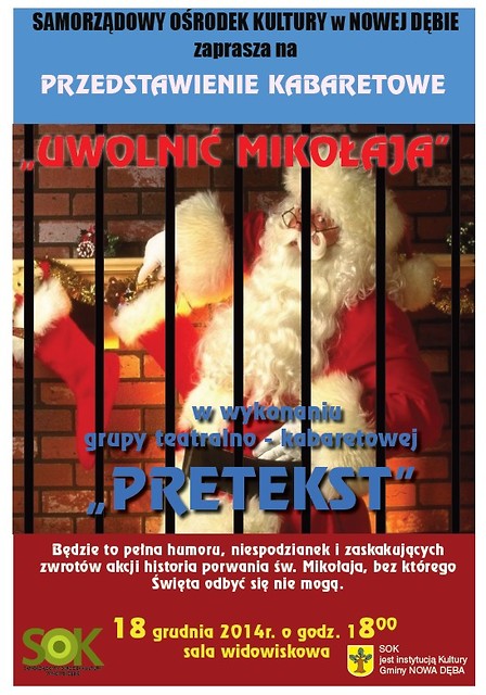 Nowa grupa teatralno- kabaretowa „PRETEKST” ,działająca od października 2014r. w SOK pod opieką p.Anny Babuli zaprasza na premierowy spektakl pt. „Uwolnić Mikołaja” 18 grudnia 2014 r. o godz. 18:00 do sali widowiskowej SOK. Będzie to pełna humoru, niespodzianek i zaskakujących zwrotów akcji historia porwania św. Mikołaja, bez którego Święta odbyć się nie mogą. Autorem scenariusza jest Mateusz Strojek, ale członkowie grupy-nowodębscy gimnazjaliści i licealiści wprowadzili wiele własnych ciekawych pomysłów, które zapowiadają świetną zabawę. Zapraszamy dzieci, młodzież i dorosłych do wspólnego spędzenia tego wieczoru.