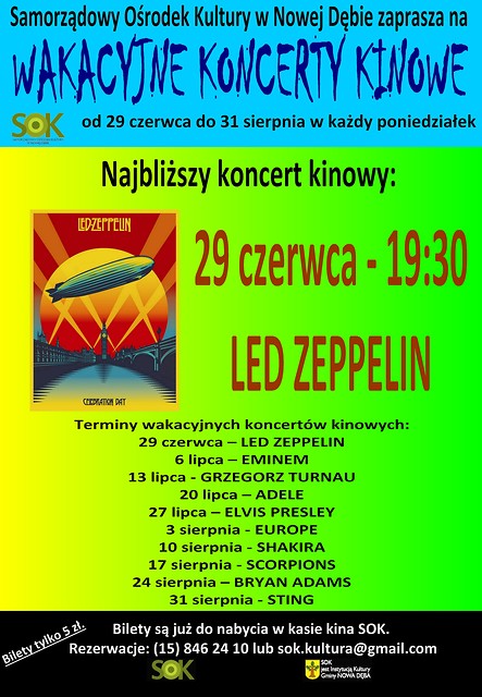 Samorządowy Ośrodek Kultury w Nowej Dębie serdecznie zaprasza na koncert kinowy LED ZEPPELIN - Celebration day. Projekcja odbędzie się w poniedziałek, 29 czerwca 2015 r. o godz. 19:30.