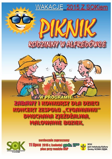 Wakacje rozpoczęły się już na dobre. Pogoda dopisuje i zachęca do zabaw na świeżym powietrzu. Samorządowy Ośrodek Kultury postanowił zorganizować kolejny wakacyjny, rodzinny piknik 11 lipca 2015 r. (sobota), tym razem w miejscowości Alfredówka. Zapraszamy na plac przy remizie OSP od godz. 17:00 do 20:00. Na dzieci czekać będzie dmuchana zjeżdżalnia, malowanie buziek, ciekawe konkursy i zabawy. W programie koncert zespołu „Cyganianki”. Jesteśmy pewni, że zapowiada się świetna zabawa dla całej rodziny!