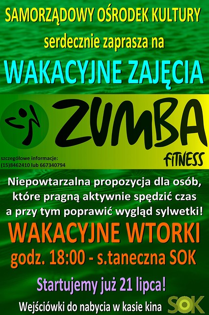 Niepowtarzalna okazja dla osób, które pragną aktywniespędzić czas a przy tym poprawić wygląd sylwetki. Wakacyjna ZUMBA rusza 21 lipca. Zajęcia prowadzone będą we wtorki o godz. 18:00 w sali tanecznej SOK. Wejściówki do nabycia w kasie kina bezpośrednio przed zajęciami. Zapraszamy!