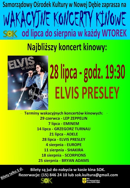 Samorządowy Ośrodek Kultury w Nowej Dębie serdecznie zaprasza na koncert kinowy ELVIS PRESLEY. Projekcja odbędzie się we wtorek, 28 lipca 2015 r. o godz. 19:30.