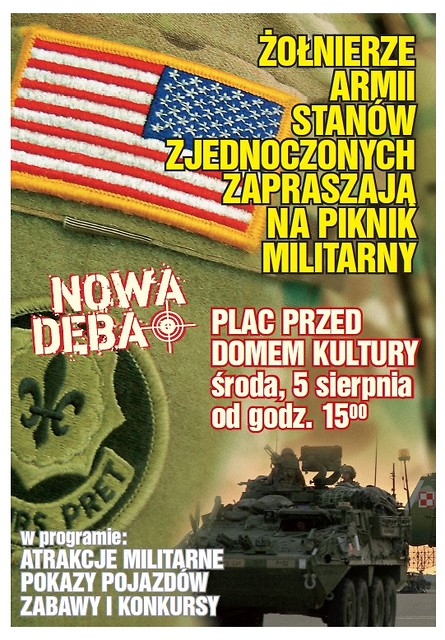 Żołnierze Armii Stanów Zjednoczonych zapraszają na piknik militarny, który odbędzie się w środę, 5 sierpnia o godz. 15:00 na placu przed Samorządowym Ośrodkiem Kultury. W programie: atrakcje militarne, pokazyj pojazdów a także zabawy i konkursy.