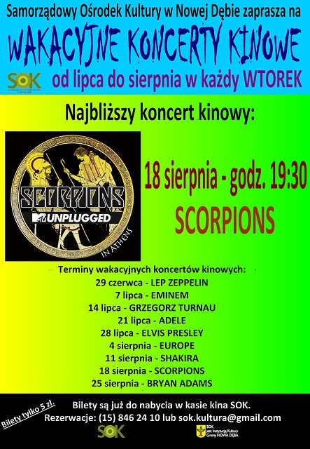 Samorządowy Ośrodek Kultury w Nowej Dębie serdecznie zaprasza na koncert kinowy SCORPIONS Projekcja odbędzie się we wtorek, 18 sierpnia 2015 r. o godz. 19:30.