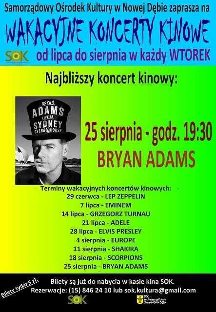 Samorządowy Ośrodek Kultury w Nowej Dębie serdecznie zaprasza na koncert kinowy BRYAN ADAMS. Projekcja odbędzie się we wtorek, 25 sierpnia 2015 r. o godz. 19:30.