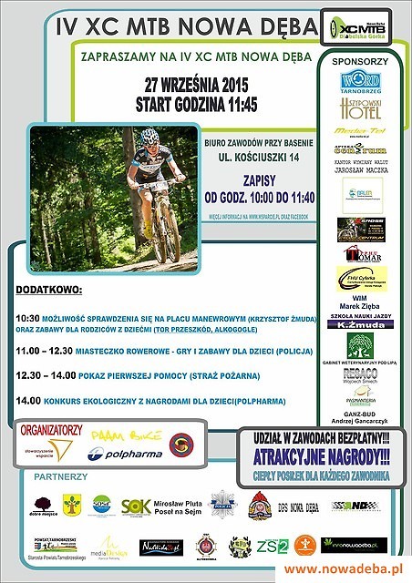 IV XCMTB Nowa Dęba - Diabelska Górka Zawody rowerowe, Miasteczko rowerowe, Pokazy pierwszej pomocy, Konkurs ekologiczny dla dzieci, Możliwość sprawdzenia swoich umiejętności jako kierowca na placu manewrowym. Więcej informacji na stronie www.wsparcie.pl