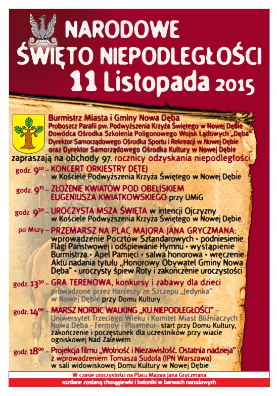 Burmistrz Miasta i Gminy Nowa Dęba zaprasza w imieniu wszystkich organizatorów na wspólne obchody Narodowego Święta Niepodległości.