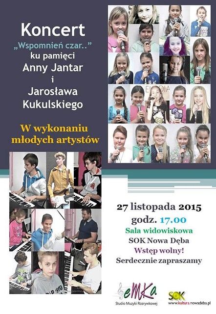 Studio Muzyki Rozrywkowej eMKa oraz Samorządowy Ośrodek Kultury w Nowej Dębie zapraszają 27 listopada 2015 r. o godz. 17:00 do sali widowiskowe SOK na wyjątkowy koncert "Wspomnień czar”- ku pamięci Anny Jantar i Jarosława Kukulskiego. Wystąpią młodzi artyści eMKi w towarzystwie swoich nauczycieli. Zapraszamy na wieczór pełen wzruszeń - wstęp wolny!