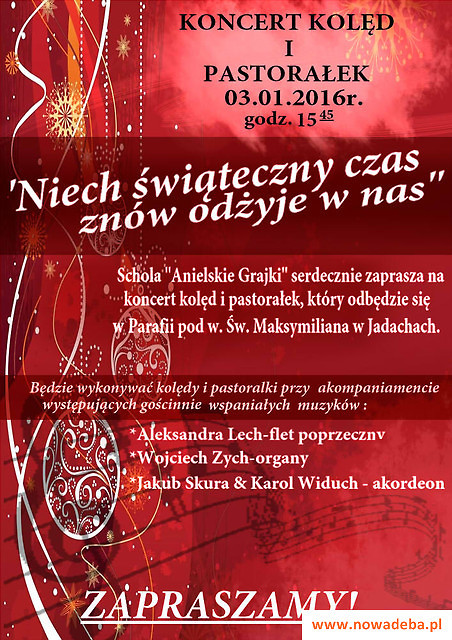 Schola "Anielskie Grajki" serdecznie zaprasza na Koncert Kolęd i Pastorałek, który odbędzie się w Parafii pod w. Św. Maksymiliana w Jadachach o godz. 15:45 :) dodaj do mojego kalendarza google