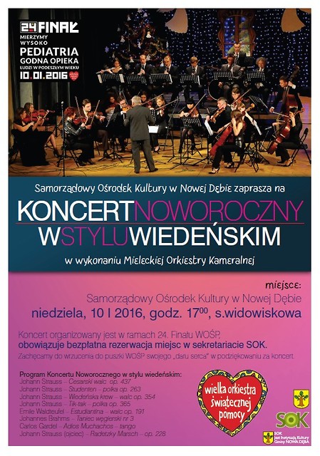 Samorządowy Ośrodek Kultury w Nowej Dębie serdecznie zaprasza na Koncert Noworoczny w wykonaniu Mieleckiej Orkiestry Kameralnej, który odbędzie się 10 stycznia 2016 r. o godz. 17:00 w sali widowiskowej SOK.