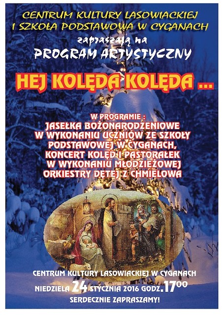 Serdecznie zapraszamy do Centrum Kultury Lasowiackiej w Cyganach na program artystyczny w świątecznym klimacie pt. „Hej kolęda, kolęda...”, który odbędzie się w niedzielę 24 stycznia 2016 r. o godz.17:00. Wystąpią dzieci ze Szkoły Podstawowej w Cyganach, prezentując Jasełka Bożonarodzeniowe, a także Młodzieżowa Orkiestra Dęta z Chmielowa w koncercie kolęd i pastorałek. Nie zabraknie również wspólnego kolędowania.