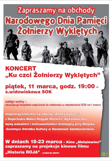 Samorządowy Ośrodek Kultury w Nowej Dębie oraz Miejsko-Gminny Ośrodek Kultury w Baranowie Sandomierskim zapraszają na koncert organizowany z okazji obchodów Narodowego Dnia Pamięci Żołnierzy Wyklętych. Koncert będzie miał miejsce w sali widowiskowej Samorządowego Ośrodka Kultury w Nowej Dębie w dniu 11 marca 2016 r. (piątek) o godz. 19.00. Inspiracją koncertu są albumy „Panny Wyklęte” z Repertuaru Maleo Reggae Rockers. Wykonawcami będą wokaliści i instrumentaliści działający przy Ośrodku Kultury w Baranowie Sandomierskim. W ramach koncertu będzie prowadzona kwesta na rzecz Fundacji „Łączka”, której celem jest poszukiwanie i upamiętnienie miejsc pochówku Żołnierzy antykomunistycznego podziemia.