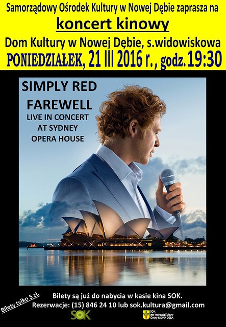 Samorządowy Ośrodek Kultury w Nowej Dębie serdecznie zaprasza na koncert kinowy SIMPLY RED. Projekcja odbędzie się w poniedziałek, 21 marca 2016 r. o godz. 19:30.