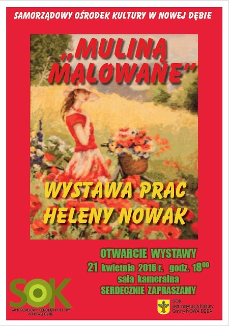 21 kwietnia 2016 r. o godz. 18:00 zapraszamy do sali kameralnej Samorządowego Ośrodka Kultury na otwarcie wystawy prac p. Heleny Nowak.