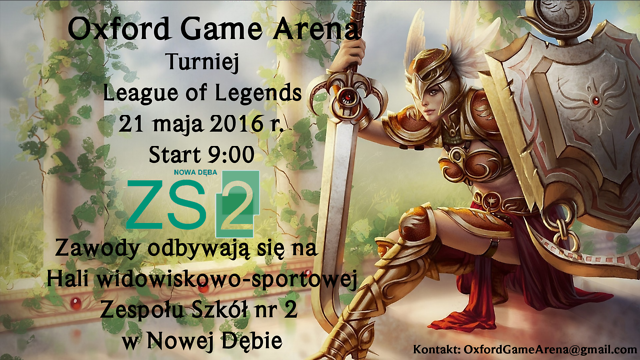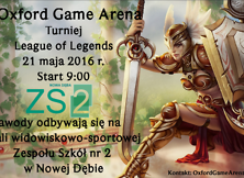 Oxford Game Arena zaprasza Sympatyków gier komputerowych - na Turniej Leauge of Legends 21 maja 2016 r. od godz. 9:00 w Hali sportowo – widowiskowej Zespołu Szkół nr 2 w Nowej Dębie.