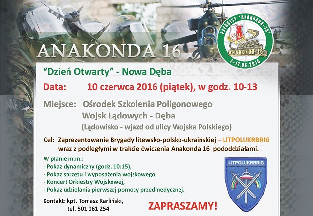 Dowództwo litewsko-polsko-ukraińskiej brygady zaprasza na nowodębski poligon w piątek 10 czerwca w godz. od 10 do 13 na "Dzień Otwarty" podczas międzynarodowych ćwiczeń "Anakonda 2016".